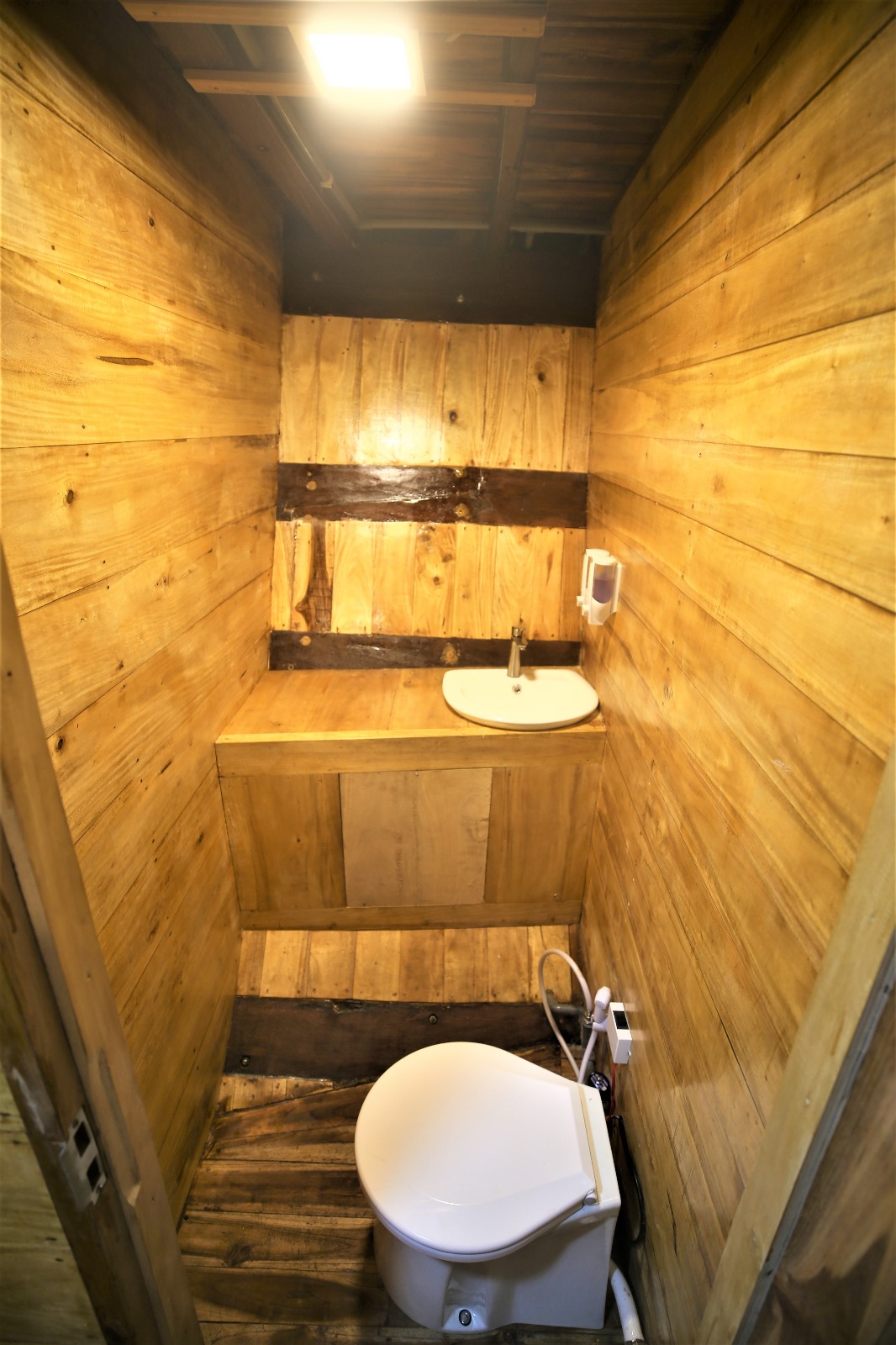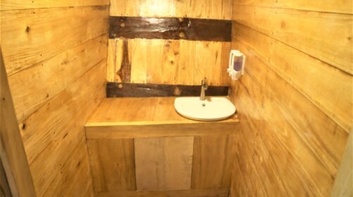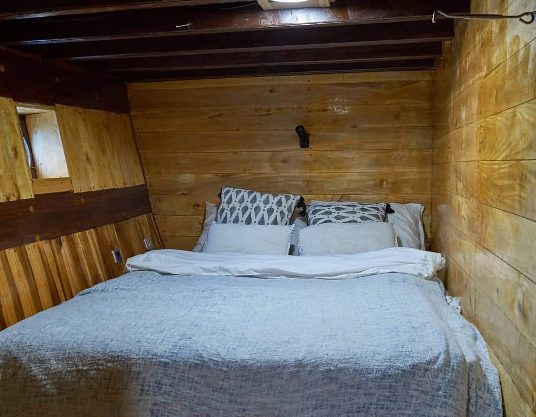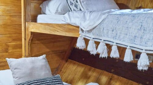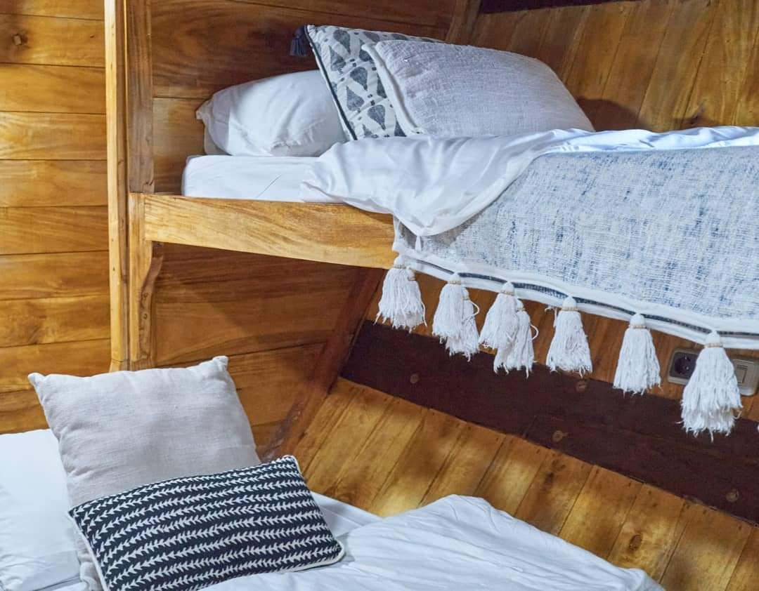 Three private cabins with en‑suite bathrooms, plus a large shaded lounge at the back equipped with beanbags and board racks.