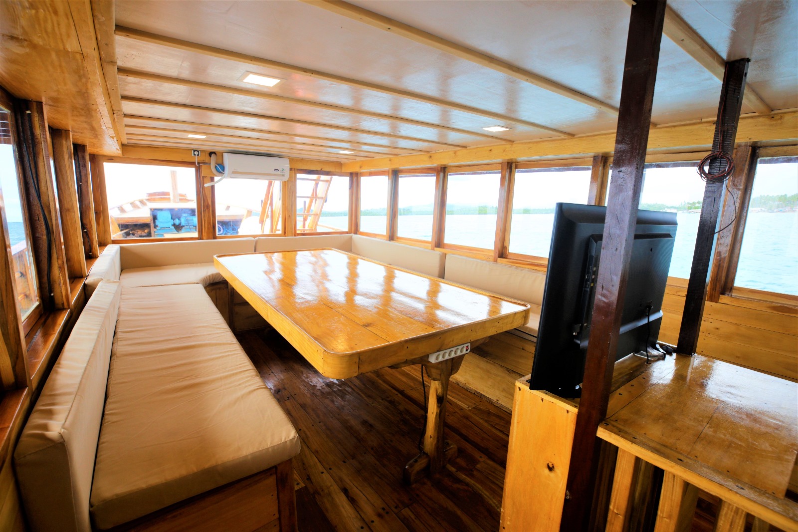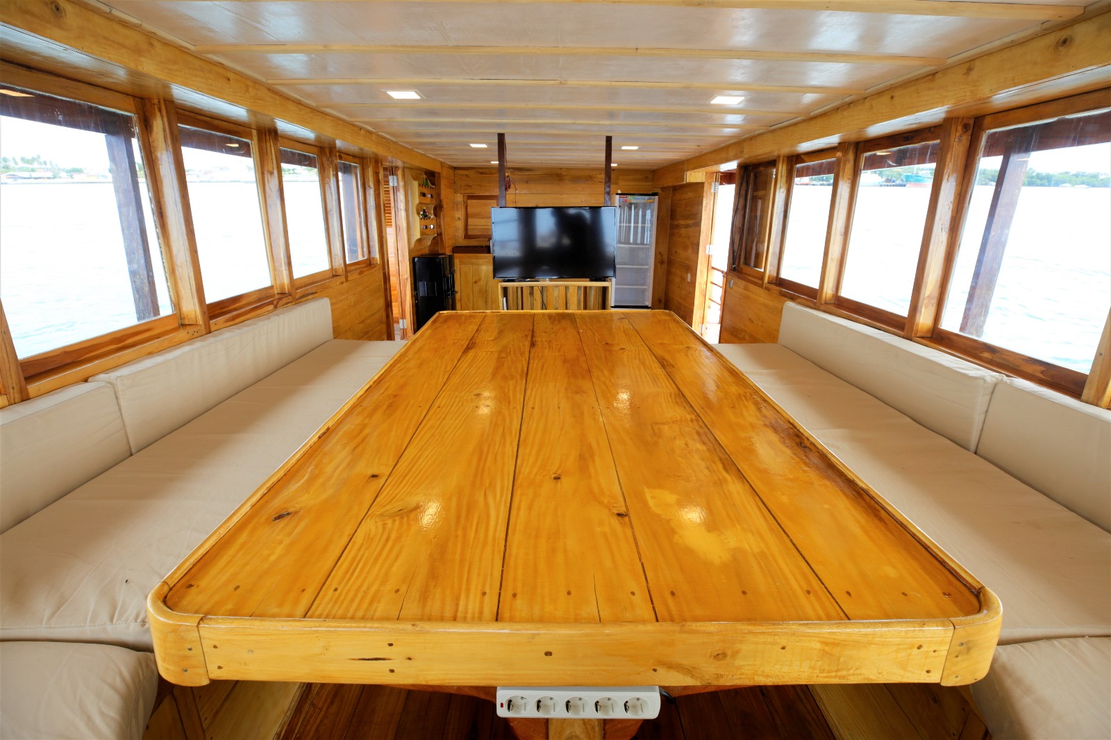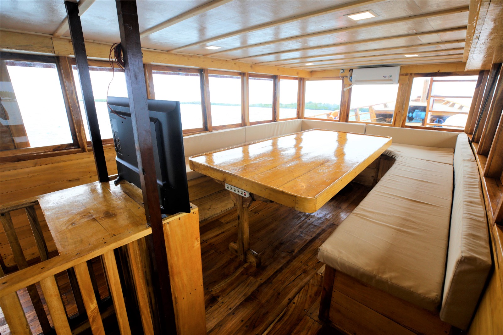 A panoramic, air‑conditioned dining area with a large table and TV — the ideal spot to refuel while watching the next set roll in.